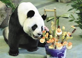 臺(tái)北市立動(dòng)物園幫團(tuán)團(tuán)圓圓提前歡慶7歲生日,準(zhǔn)備冰品水果蛋糕讓它們大飽口福,圖為圓圓用餐情形。圖片來(lái)源:臺(tái)灣《聯(lián)合報(bào)》