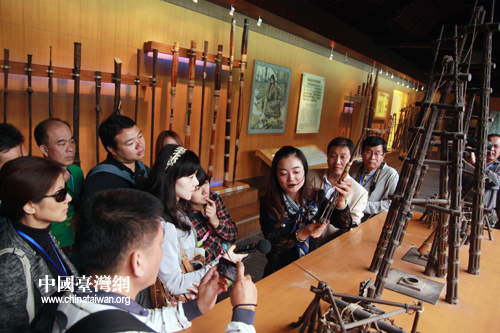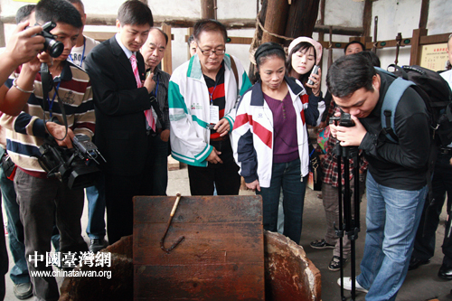 兩岸記者在自貢鹽業(yè)歷史博物館里參觀古代井鹽工具。(中國(guó)臺(tái)灣網(wǎng) 馬迪 攝)