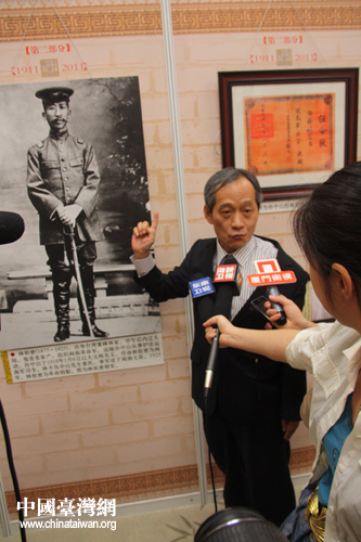 站在自己祖父的肖像前,臺胞林光輝先生很自豪地向媒體介紹先人的光榮事跡。(中國臺灣網(wǎng) 楊麗 攝)