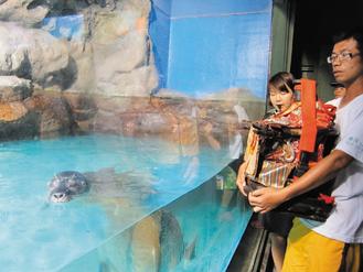 嘉義奉天宮開臺媽祖臨時“指示”信徒到臺灣海洋館參觀,信徒雙手捧著神像“觀賞” 缸里的海豹。圖片來自臺灣媒體