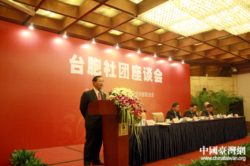 中國臺灣網11月14日北京消息 作為中華全國臺灣同胞聯誼會(簡稱全國臺聯)成立三十周年慶典活動之一的“臺胞社團座談會”,今天下午在北京首都大酒店召開。座談會以世界各地臺胞社團人士為主體,對于加強海外、港澳和臺灣島內臺胞社團之間的溝通與聯系,共謀合作與發展,推動兩岸民間交流深入發展,促進兩岸關系和平發展,具有十分重要的意義。