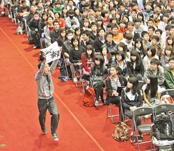 臺(tái)大校慶大會(huì)上,臺(tái)大學(xué)生聯(lián)盟代表舉白布條沖入會(huì)場(chǎng),抗議校方以訴訟手段要求紹興社區(qū)居民拆屋還地和賠償損害。(圖片來(lái)源:臺(tái)灣《中國(guó)時(shí)報(bào)》)