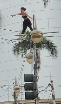 昨天下午2時許,許女到屏東縣刑警大隊找鄭男討債不成,氣得爬上警局前燈桿,哭喊“欠錢的警察出來下跪,不下跪就跳下去死給你看”,許女邊罵邊脫掉衣服,只剩下黑色內衣,并將長發(fā)挽起,不停地叫罵。