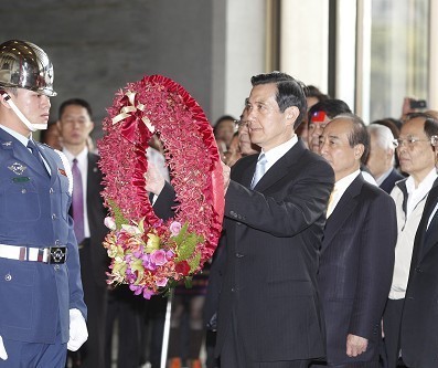據(jù)報道,馬英九今天上午9時率領(lǐng)國民黨副主席詹春柏、林豐正、蔣孝嚴等黨內(nèi)一級主管,以及行政部門負責(zé)人吳敦義、民意機構(gòu)負責(zé)人王金平等前往孫中山紀念館向?qū)O中山銅像獻花、行三鞠躬禮。國民黨今年黨慶活動將于11月26日移師臺中豐原舉行,并結(jié)合競選活動全力鞏固中(臺中)彰(彰化)投(南投)選情。(中國臺灣網(wǎng) 吳斌)