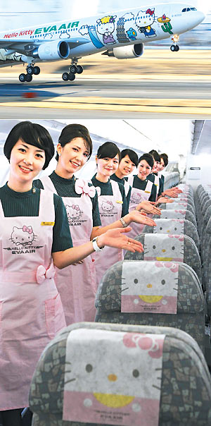 可愛的Hello Kitty飛機及其內景。(圖片來自臺灣媒體)