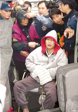 五月天樂團主唱阿信的堂哥陳文宗(圖前坐輪椅),因遭槍擊下半身癱瘓,涉嫌由女看護陳美云(圖后穿紅衣婦人)推著輪椅四處販毒,昨日被臺北市刑偵隊逮捕送辦。(圖片來自臺灣媒體)