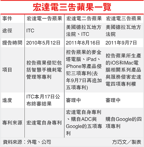 專家表示,宏達電已想盡辦法從不同地方購入專利,并在ITC、地方法院提出告訴,但該公司仍是目前前三大的Google Android陣營業者里,專利組合最弱的廠商。