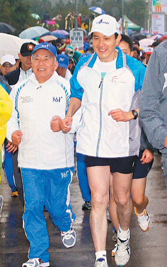 馬英九(右)在風(fēng)雨中跑完2012金門馬拉松賽健康休閑組。(圖片來(lái)源:臺(tái)灣《聯(lián)合報(bào)》)