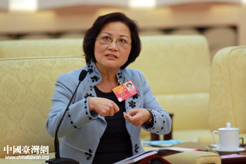 10日下午,在十一屆全國人大五次會議臺灣代表團開放團組的活動現場,陳云英回答記者關于林毅夫先生能否在有生之年踏上寶島故土的問題。(中國臺灣網 王偉 攝)