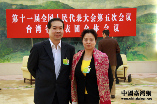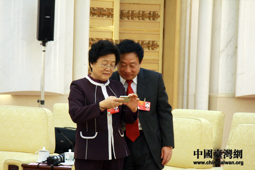 會議開始前,兩位政協委員特意到人民大會堂臺灣廳合影留念。(中國臺灣網 王偉 攝)