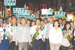 鹿港鎮(zhèn)長補選選前之夜,上千名綠營支持集結(jié),蔡英文、蘇貞昌等天王陪同民進黨參選人黃振彥(中)徒步拜票。(圖片來源:臺灣《中國時報》)