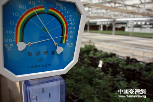 順義國際鮮花港花卉生產(chǎn)溫室中的溫濕度表。(中國臺灣網(wǎng) 羅旭婷 攝)