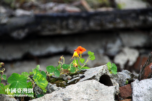 災后四年,采訪團來到殘破不堪的北川老城遺址祭拜遇難同胞。即將離開時,記者發現一朵橘紅色的小花在殘破的廢墟上悄然綻放。(中國臺灣網 楊麗 攝)
