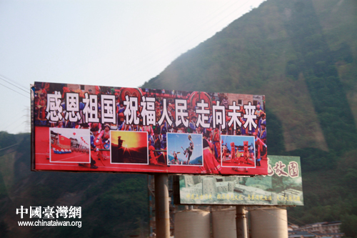 從遺址前往新北川,高速路邊巨大的感恩標語。(中國臺灣網(wǎng) 楊麗 攝)