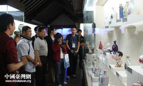 采訪團記者們對運河酒文化館內臺灣專區的展品興趣濃厚。(中國臺灣網 郭瑩瑩 攝)