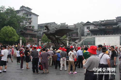 中國臺灣網5月19日鳳凰消息 今天上午,第九屆海峽兩岸媒體來湘聯合采訪團一行,走訪了湘西州鳳凰縣,參觀了鳳凰古城、沈從文故居、楊家祠堂、熊稀齡故居,并且沱江泛舟,近距離感受鳳凰古城魅力。(記者 張曉靜)