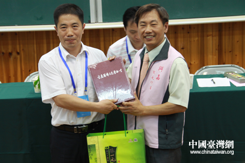 北京市豐臺區教育工作委員會副主任牛立春與興嘉小學校長陳火川互贈禮物(中國臺灣網 李丹 攝)