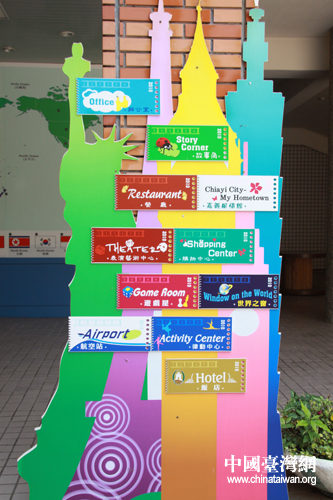英語村的設置令人驚艷,當學生步入英語村后,都會因驚艷與她的精致及情境化的主題館,在情意上更加強學習的動機,愿意主動學習英語。圖為英語村指示牌。(中國臺灣網 李丹 攝)