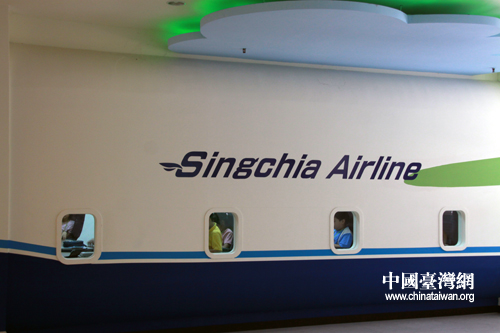 仿機場的設計,有海關以及機艙,讓學生有如出國的體驗,營造出國的感受。圖為興嘉小學國際英語村的學生們在仿真機艙中上課。(中國臺灣網 李丹 攝)