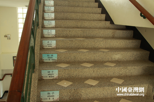 每個樓梯臺階都有關于服裝類的中文、英文、閩南語貼畫。(中國臺灣網 李丹 攝)