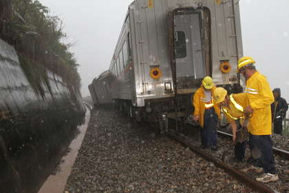 中國臺灣網6月14日消息 據臺灣媒體報道,今(14)日下午2時27分,臺東傳出自強號列車出軌意外,高雄新左營開往花蓮的臺鐵305次列車,行至大武車站和瀧溪車站之間,駕駛發現前方有泥石流掩埋鐵軌致使剎車不及,整輛列車沖上土堆出軌,所幸車上105名乘客平安無事。