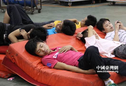 舞美老師們已經兩天沒有回家了,累了就在墊子上休息一下。他們戲稱自己是“我們是抬道具”。(中國臺灣網 張寧 攝)