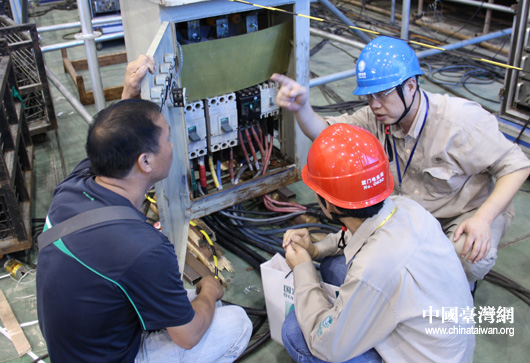 他們是“電力人”,為了晚會的電力保障,認真檢查調整線路 (中國臺灣網 張寧 攝)