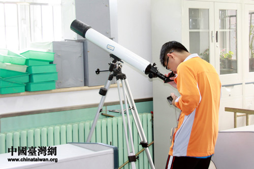 來自臺灣的初中生正在使用教室后方的望遠鏡。(中國臺灣網 劉承思 攝)