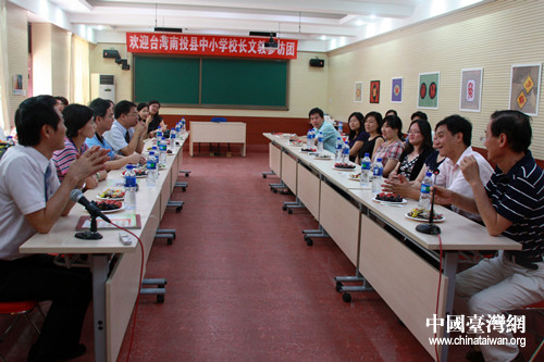 臺灣教育工作者正與西什庫小學校長阮平先生進行交流討論。(中國臺灣網 劉承思 攝)