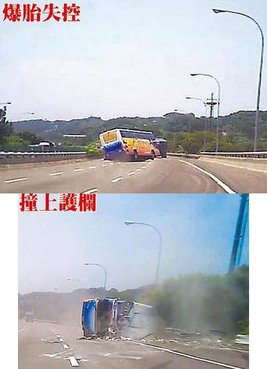 從民眾提供的行車記錄器影像可推斷,司機(jī)當(dāng)時在高速行駛中,車輛左后輪壓到異物爆胎,車體左搖右晃,司機(jī)無法控制車輛,導(dǎo)致側(cè)滑撞到路旁護(hù)欄翻車。而真正肇事原因,需等待臺灣“交通事故委員會”鑒定厘清。
