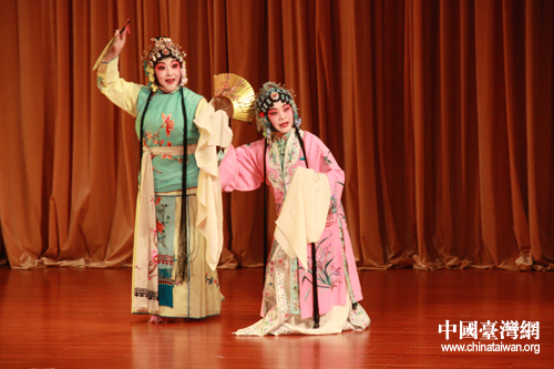 北京師范大學(xué)以雅昆曲社指導(dǎo)老師歐陽啟明(右)與北京昆曲研習(xí)社(楊丹飛)等人表演《牡丹亭·游園驚夢(mèng)》。(中國臺(tái)灣網(wǎng) 孟雅詩 攝)