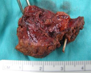吳明哲醫師表示,在患者腹部開了3個小洞,發現肝的左外葉患部有一根約2厘米細長異物,被包在膿瘍內,順利切除取出約1/5的肝臟,證實是一根堅實的魚刺。