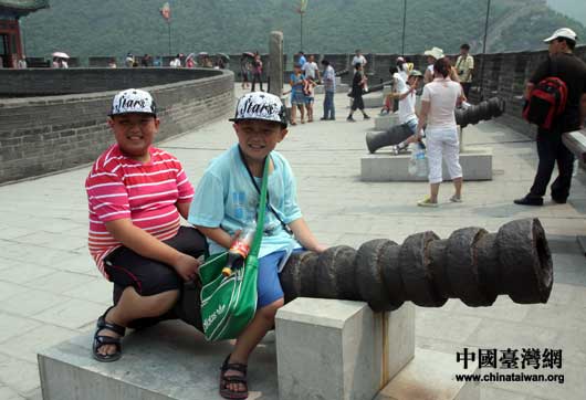 來自臺灣桃園縣清溪小學的林佑林翰兄弟倆,愛上了長城的古炮臺。(中國臺灣網 黃艷艷 攝)