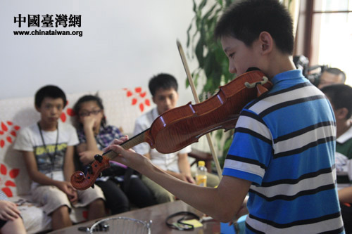 聯歡會上,北京小朋友朱顯暉表演小提琴,歡迎臺灣同學到來。(中國臺灣網 黃艷艷 攝)