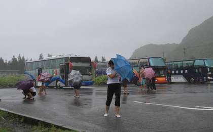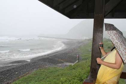 豐濱鄉東海岸石梯坪風景區風強雨驟,大陸客持傘當盾牌,逆風觀浪。圖片來自臺媒