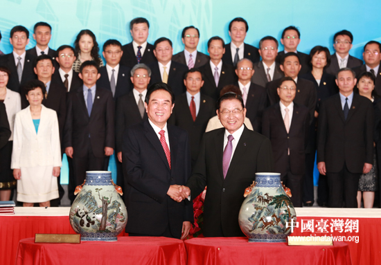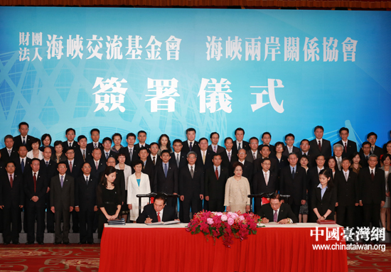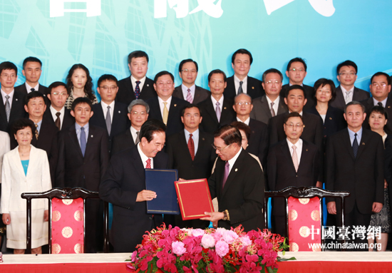 8月9日下午,海峽兩岸關系協會會長陳云林與臺灣海峽交流基金會董事長江丙坤在臺北共同簽署了《海峽兩岸投資保護和促進協議》與《海峽兩岸海關合作協議》。(中國臺灣網 田云鵬 攝)