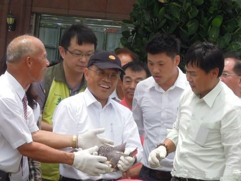 工作人員從網里抓鯛魚拿給前來參觀的貴賓拍照留念,蘇貞昌帶著白色棉布手套接下一尾魚,但魚扭來扭去抓不穩,旁邊的工作人員還出手幫忙。蘇貞昌試圖把魚立起來讓媒體拍照,雙手突然抽搐了一下,馬上把魚放入池中。原來他的手被魚鰭刺傷了,而且鮮血直流。