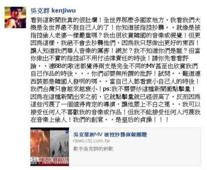 不滿被控MV抄襲,吳克群臉書開炮。來源:臺灣媒體