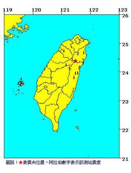 中國臺灣網8月20日消息 據臺灣媒體報道,今(20)日清晨6時20分,宜蘭發生里氏3.8級地震,震中位于宜蘭縣南澳鄉,震源深度7.3公里,各地震度情形為:宜蘭縣南山3級,太魯閣2級,合歡山、臺中市德基和新竹縣竹東1級。(中國臺灣網 李帥)