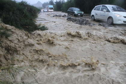 臺1線公路楓港段野溪一處路面僅剩一條車道供雙向車流沿泥石流通行。(圖片來自臺媒)