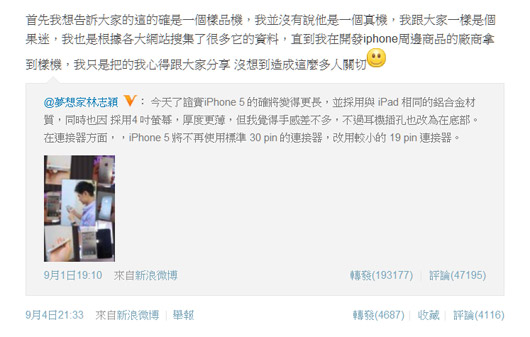 林志穎本月1日秀出iPhone5,蘋果官方否認是新機,被網友批評愛現眼,他為自己喊冤,稱沒必要炒新聞。而在13日凌晨的蘋果新品發布會上,iPhone5正式曝光,沒想到竟被林志穎說中,讓網友紛紛改口,直呼:“你好神!”還有人搞笑稱是喬布斯托夢!并打趣認為他肯定是穿越了,否則怎能預知一切。