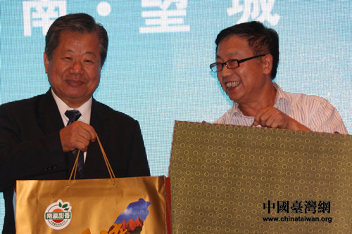 中國旅游協會休閑農業與鄉村旅游分會會長甘士明與中國海峽兩岸農業協會理事長蔡勝佳互贈禮物。(中國臺灣網 郭瑩瑩 攝)