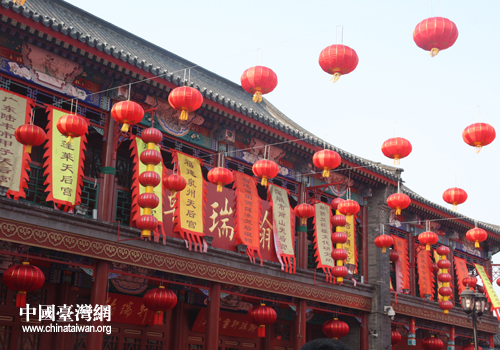 天津古文化街張燈結(jié)彩。(中國臺灣網(wǎng) 郭慶娜 攝)
