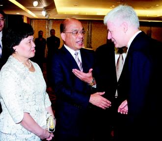 民進黨主席蘇貞昌(中)與太太詹秀齡(左)昨天出席民進黨26周年黨慶酒會,與AIT臺北辦事處處長馬啟思(右)頻頻交換意見。圖片來源:臺灣《聯合報》