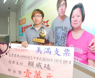 中國臺灣網10月9日消息 據臺灣“中廣新聞網”報道,臺灣高雄正修科技大學電子系3年級學生賴威廷,母親因為肝硬化,一度陷入肝昏迷,醫師評估必須換肝才能活命。賴威廷3年前就表達捐肝救母的意愿,由于他是家中獨子,父母親舍不得讓他捐肝,直到今年5月底,母親的肝臟急速衰竭,終于同意讓兒子捐肝。校方今天公開表揚賴威廷的孝心,頒給他“孝悌楷模”獎座和1萬元(新臺幣)獎學金,賴媽媽感動的說:“兒子是她的生命,她是兒子的心肝”。