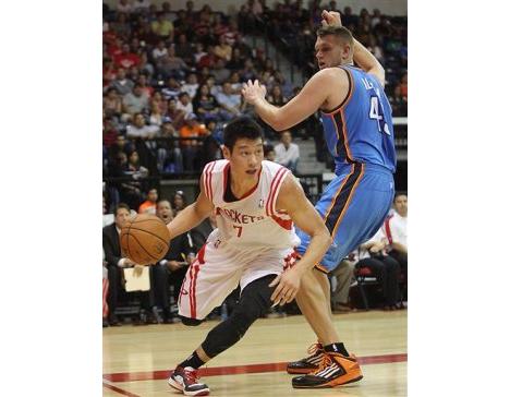 林書豪在熱身賽首戰面對雷霆的比賽中上場20分鐘,投3中1繳出3分6助攻3抄截的成績。圖片來自臺媒