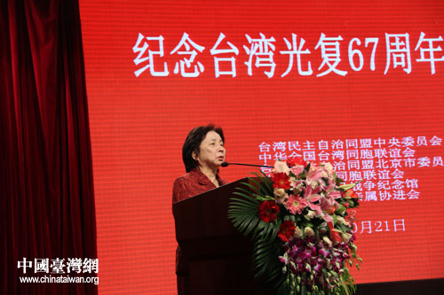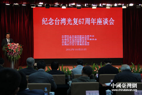 中國臺灣網(wǎng)10月21日北京消息 10月21日,由臺盟中央、全國臺聯(lián)及北京市臺盟、臺聯(lián),中國人民抗日戰(zhàn)爭紀(jì)念館、臺灣抗日志士親屬協(xié)進(jìn)會(huì)聯(lián)合舉辦的“紀(jì)念臺灣光復(fù)67周年座談會(huì)”在中國人民抗日戰(zhàn)爭紀(jì)念館舉行。