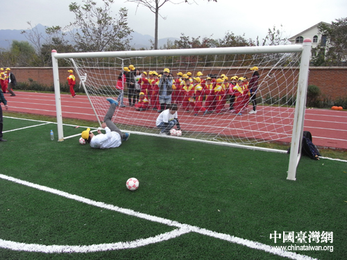 “鐵門(mén)”大哥哥在小朋友們的八方進(jìn)攻下,終于在撲救一個(gè)刁鉆射門(mén)時(shí),摔了個(gè)四腳朝天,逗的小朋友們哈哈大笑(中國(guó)臺(tái)灣網(wǎng)記者 蕪?fù)瑪z)