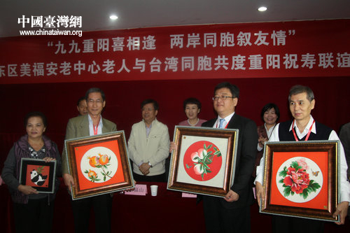 表演過后,臺灣參訪團王洪慶先生、王春英女士與養老院老人互贈禮物,祝福兩岸老人吉祥長壽。(中國臺灣網記者 郭瑩瑩)