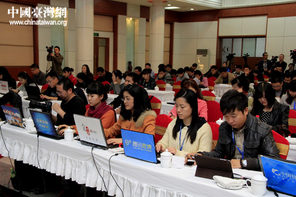 10月22日下午,甘肅省人民政府新聞辦公室召開新聞發布會,向網絡媒體介紹蘭州新區情況。圖為參加新聞發布會的各家媒體記者爭相報道。 (中國臺灣網 董憲超 攝)